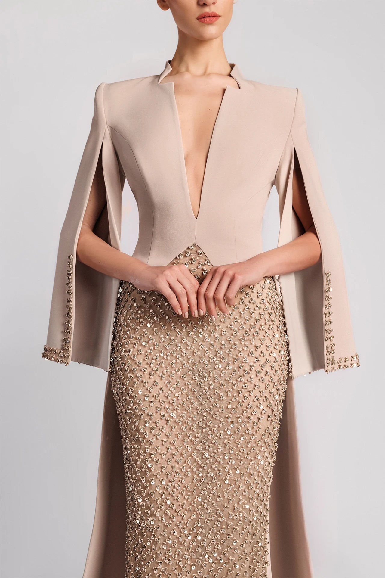 Nude crepe dress features a plunging neckline, cape sleeves with slits along the arms , a fitted bodice that flows into a mermaid skirt with a train ,and a skirt adorned with sequin embroidery .