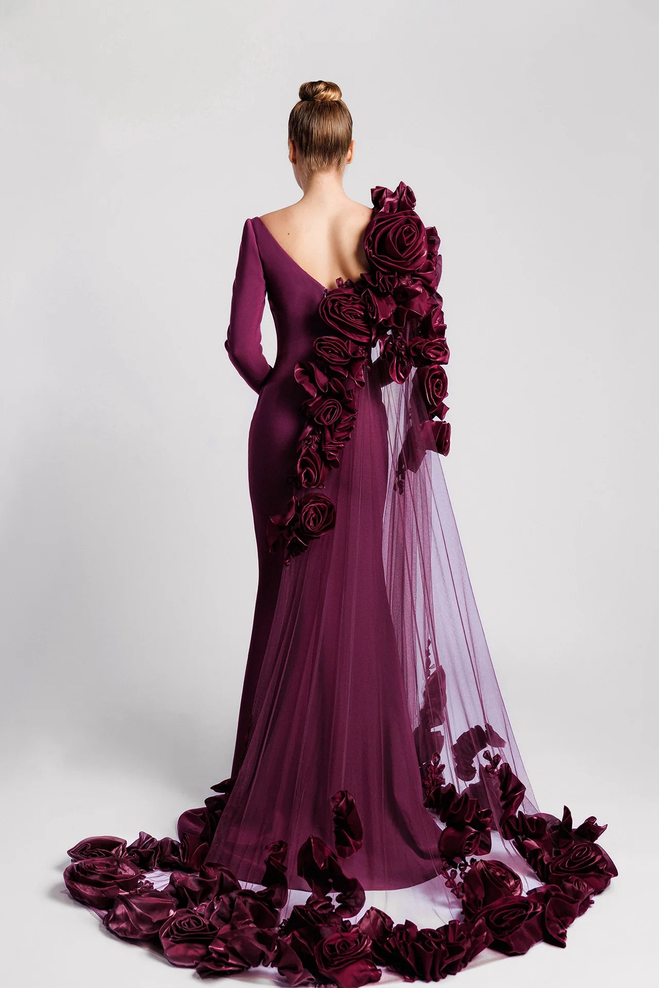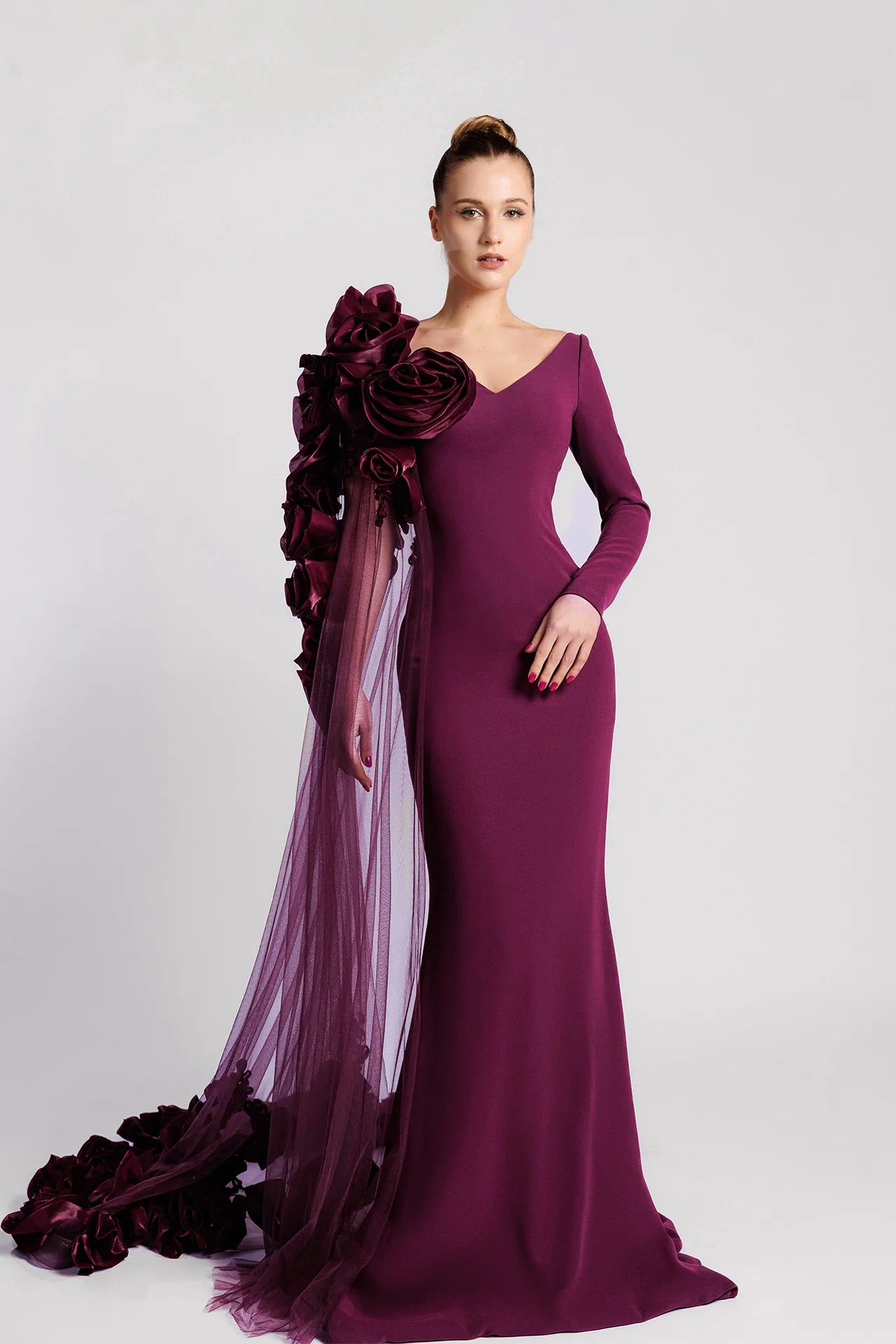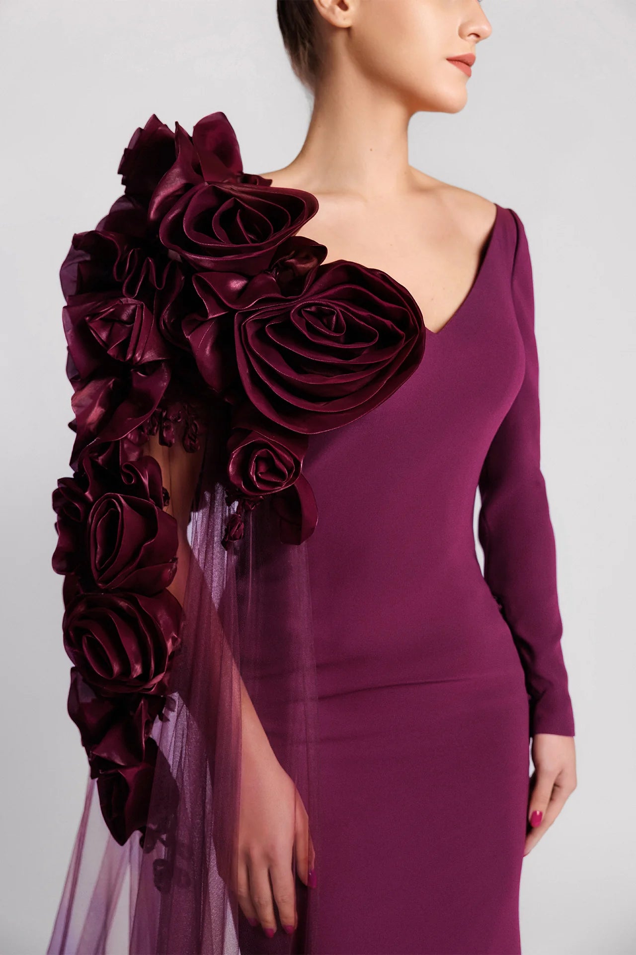 Mermaid Evening Dress with Cape Sleeve and V-Back ,Burgundy long-sleeved crepe mermaid dress with a wide V neckline and a fitted bodice. One sleeve is long and fitted, while the other is a cape sleeve made of tulle and organza flowers. The dress has a V-shaped open back.Burgundy Color Size 42(10) Ready to Ship
