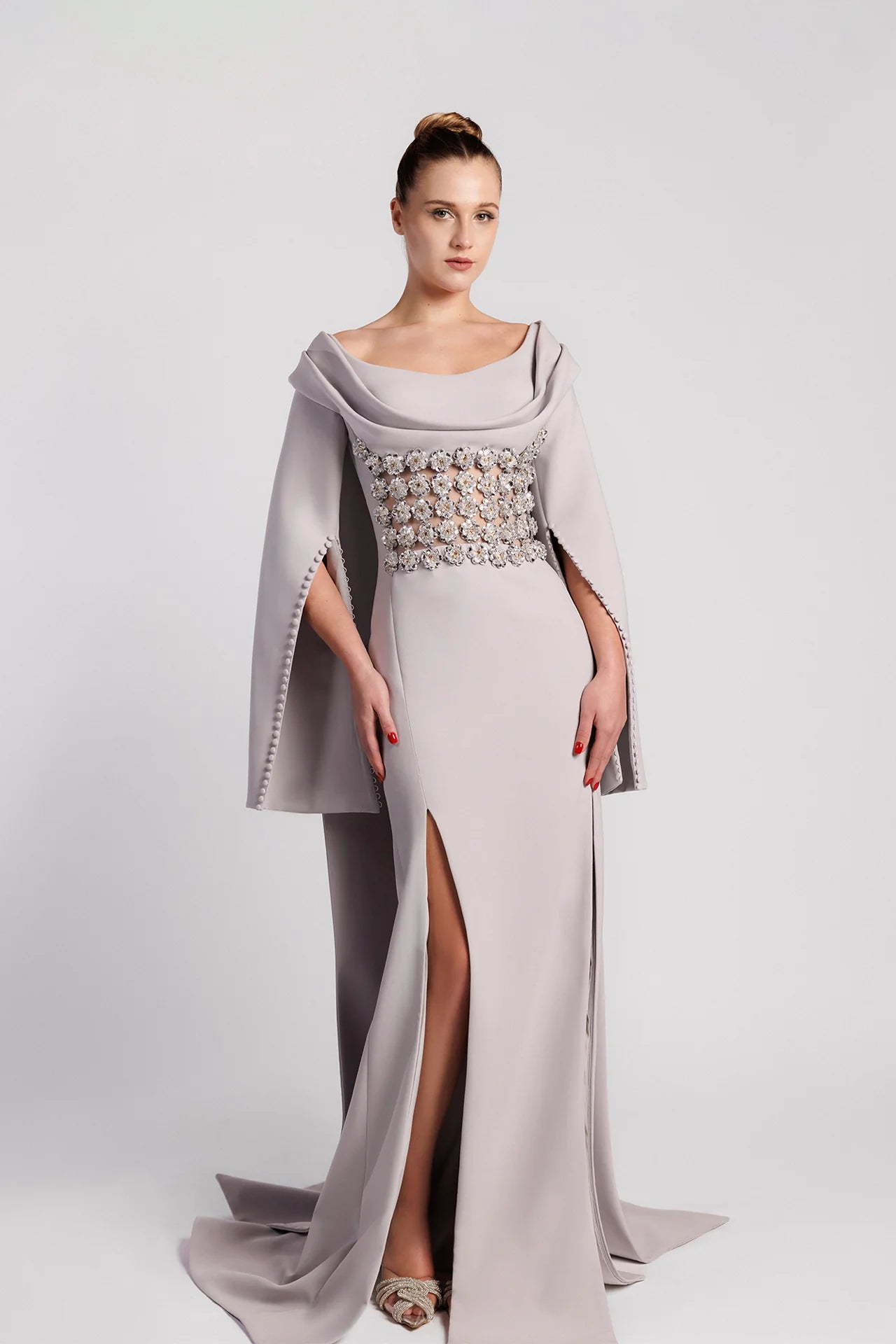 Off-the-Shoulder Evening Dress with Draped Bust and Embroidered WaistLight gray crepe off-the-shoulder straight-cut dress with a round neckline and bell sleeves that have buttoned slits. It features a draped bust, an embroidered waist with silver flower stones, a straight skirt with a side slit, and a Watteau train.
