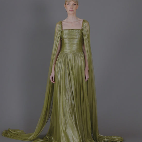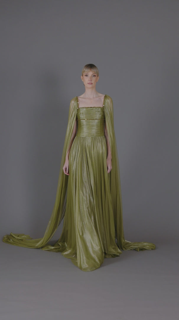 Draped dress in olive green silk foiled tulle with baguette detailing