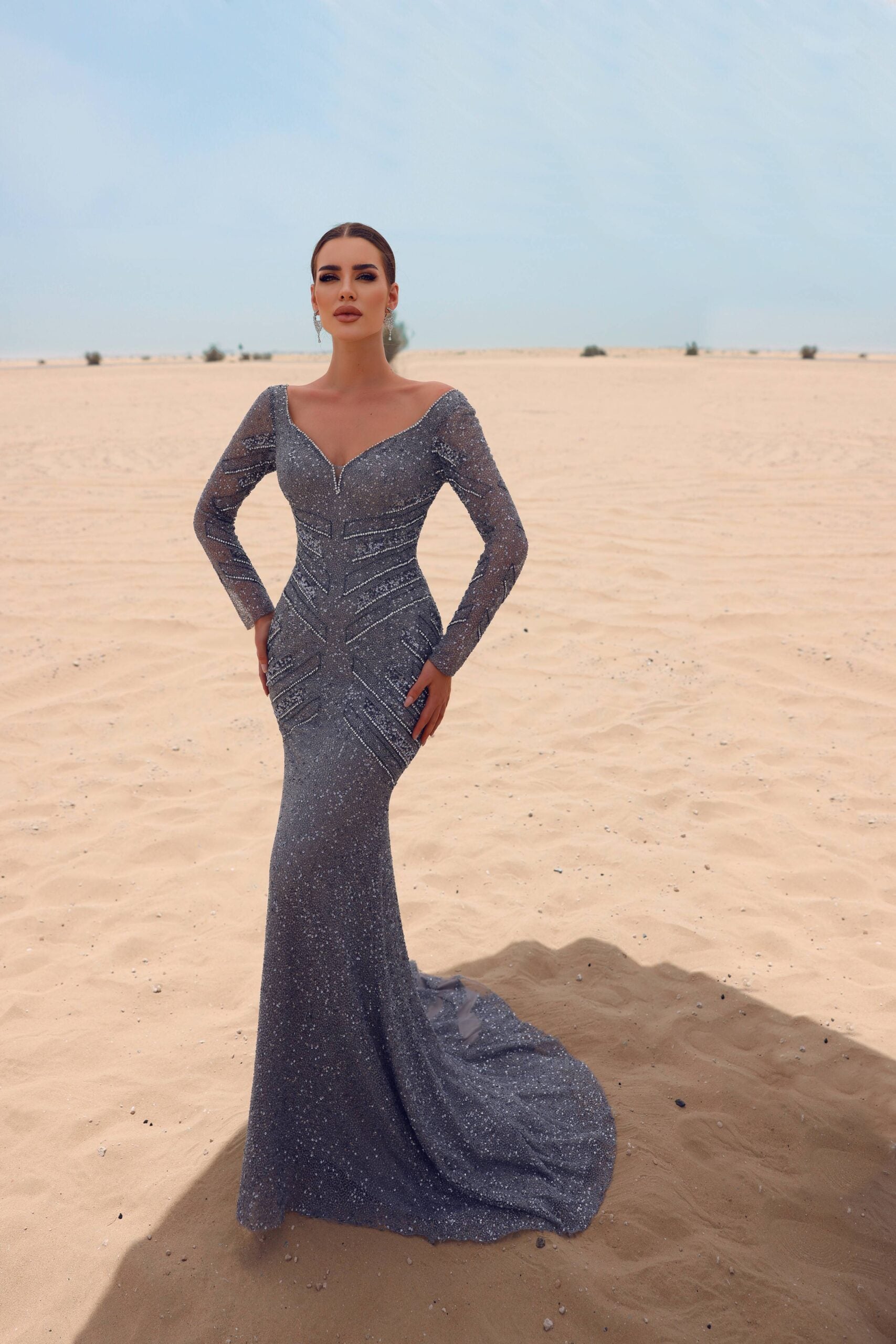 CHIC AND HOLLAND EW990006 DRESS Grey Color Size 16Ready To Ship Can Be Preorder Matching detachable tulle embellished Over skirt