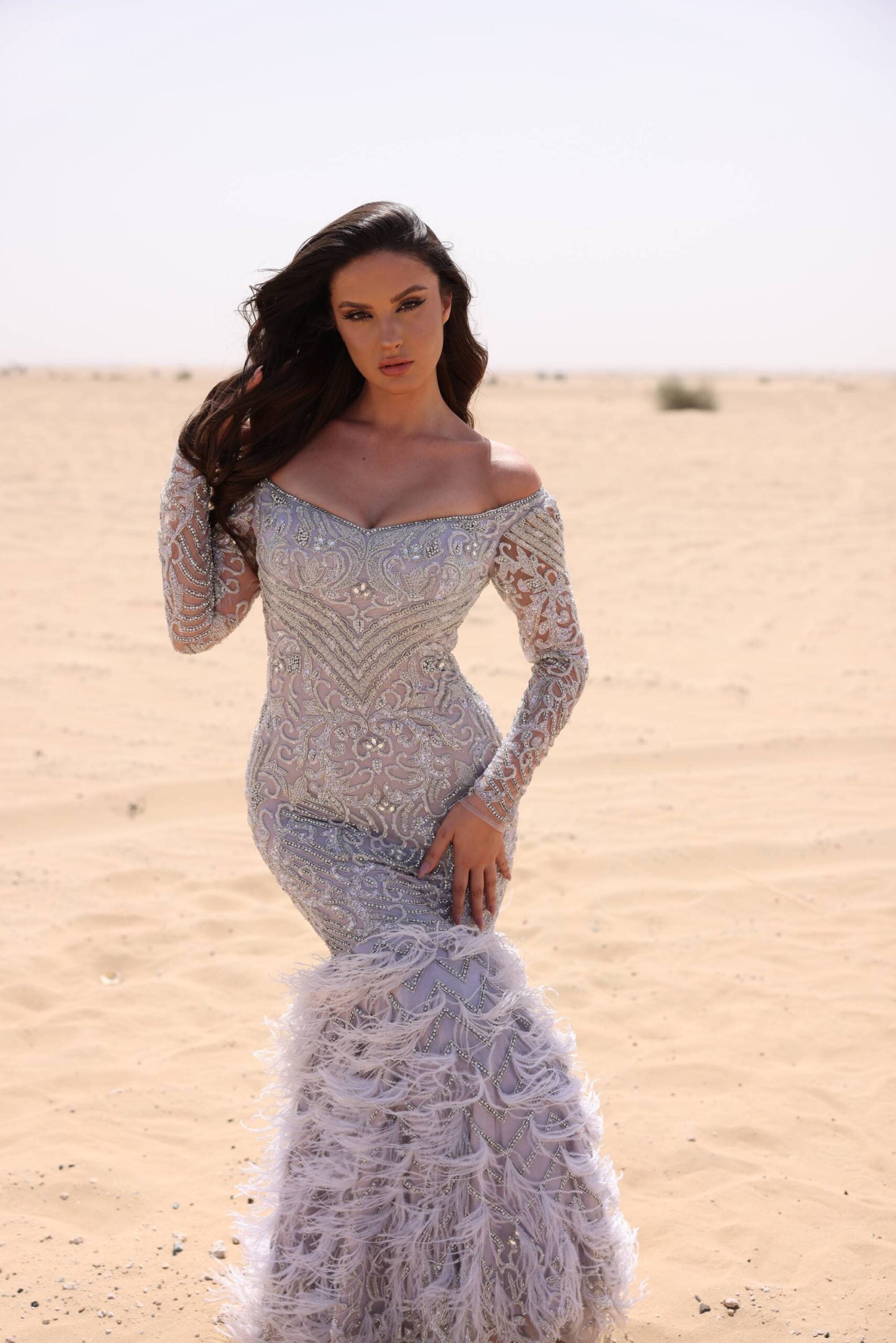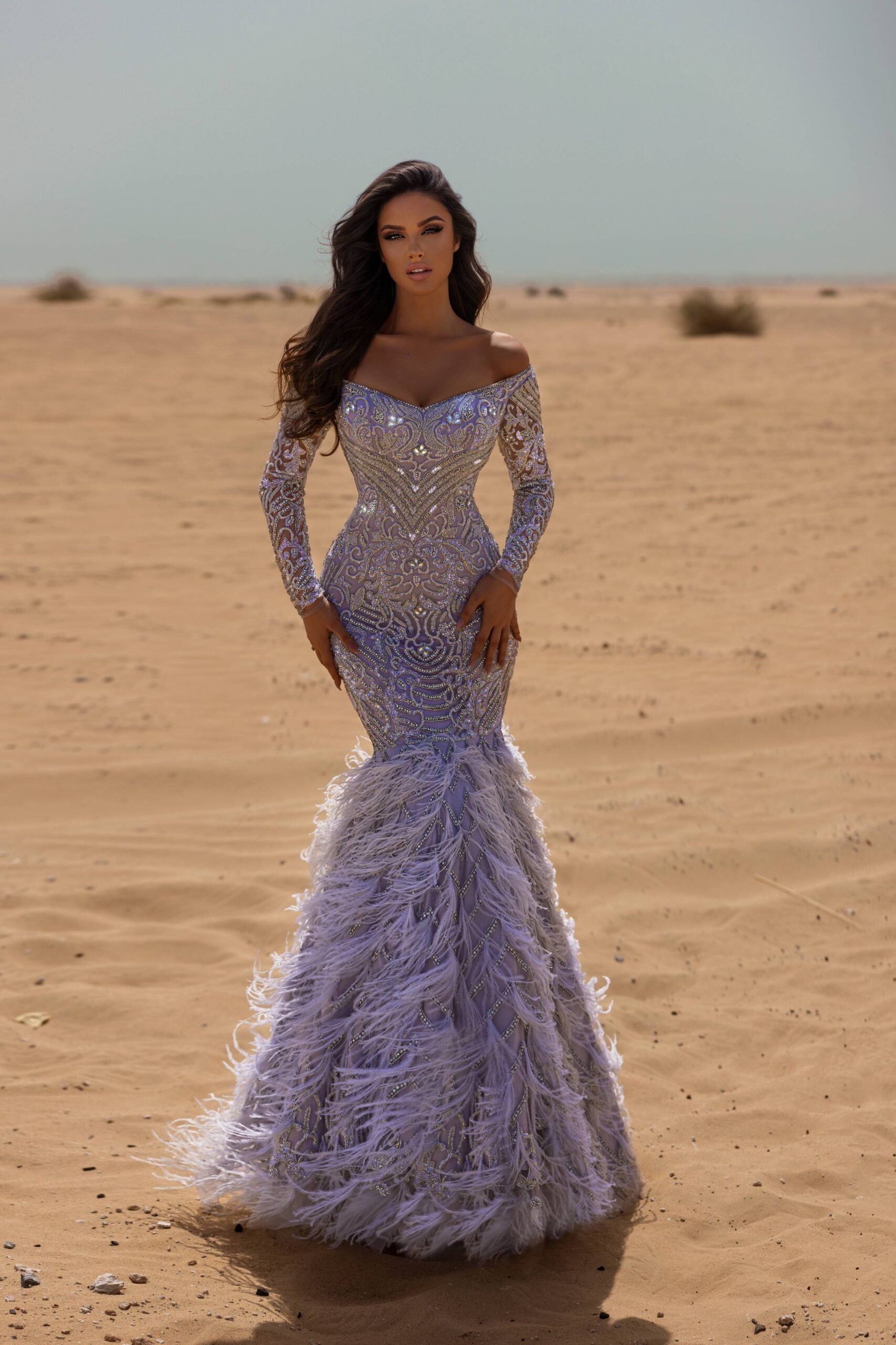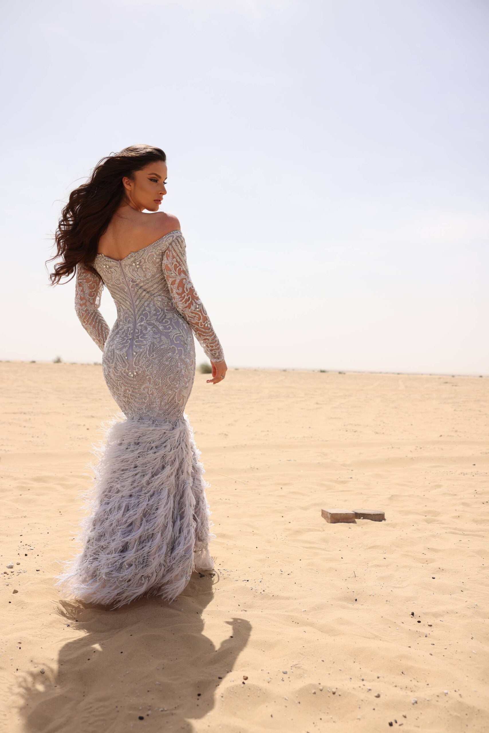 off-the-shoulder sleeves, delicate V-neckline, and sequin embellishments are a perfect combination of sophistication and femininity. The full skirt and fringe detail add a touch of drama and glamor to this dress