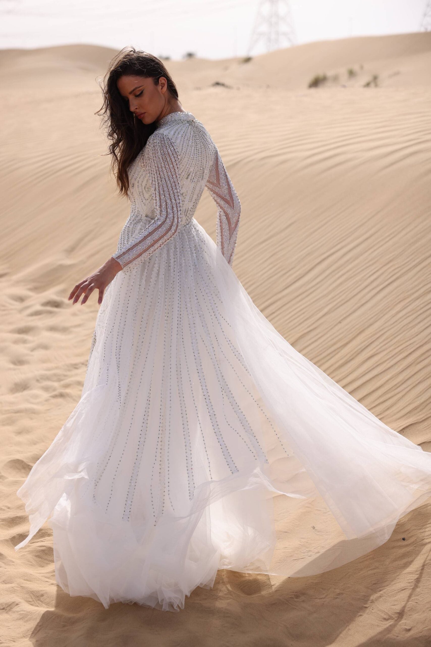 The dress features a scoop neckline with White opaque embroidery on tulle, alowithout over skirt