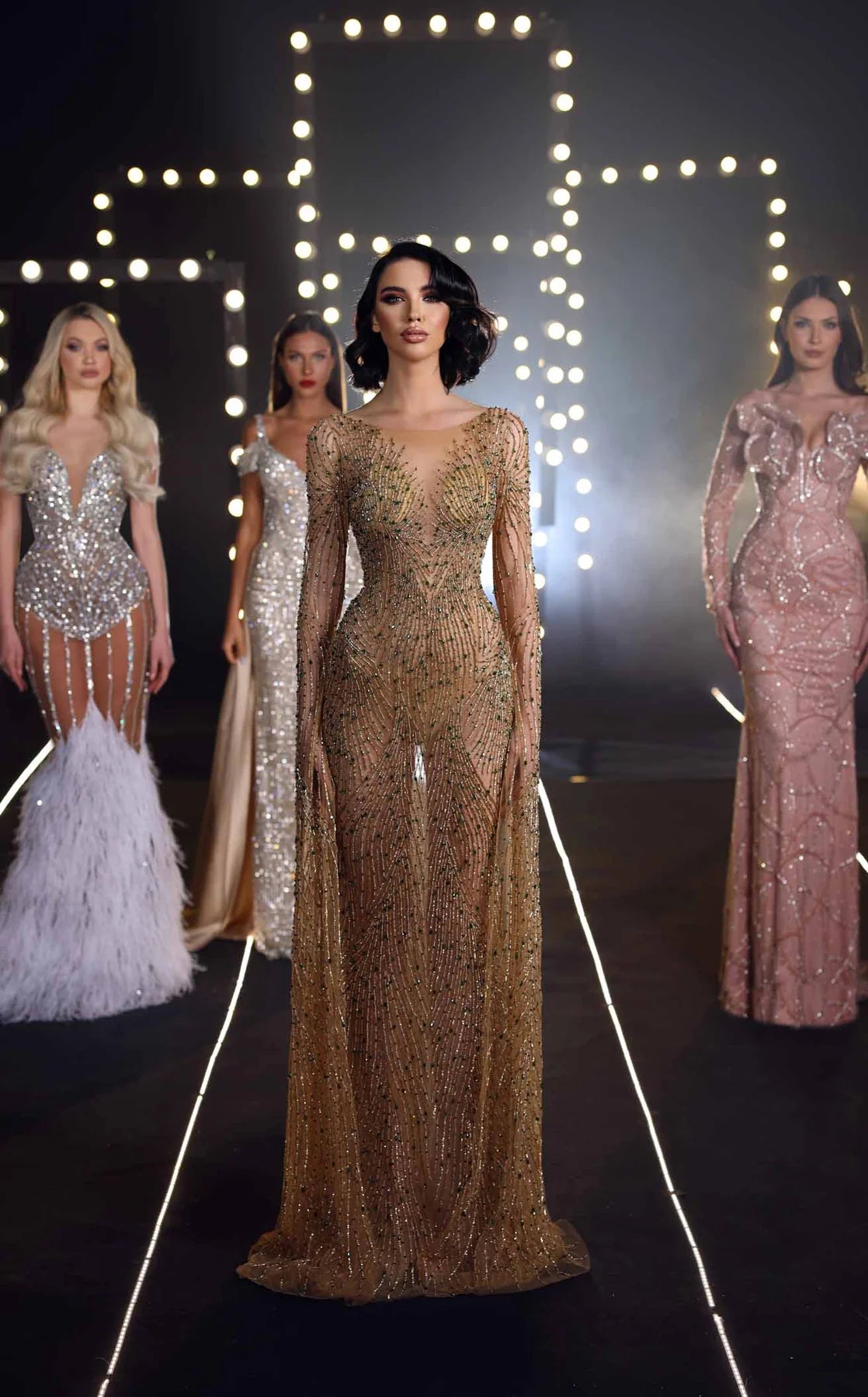 CHIC AND HOLLAND HF110165 DRESS Its Lining a sheer fabric studded with strass all over. This column dress features an illusion neckline and floor-length long sleeves. The center-back zippered closure forms a fitted column silhouette and the long length of the dress create a sense of drama and elegance, while the strass studding adds a touch of modernity and edge.Size 14 Ready To Ship