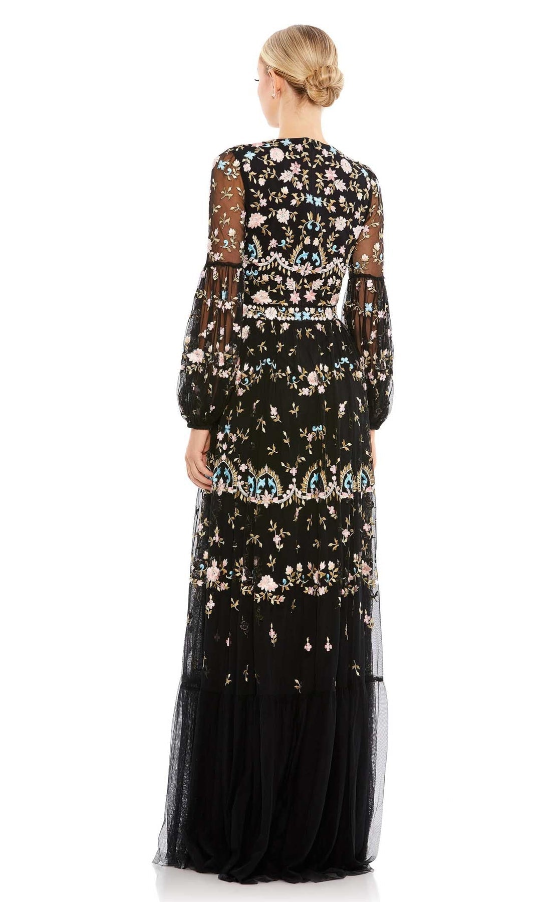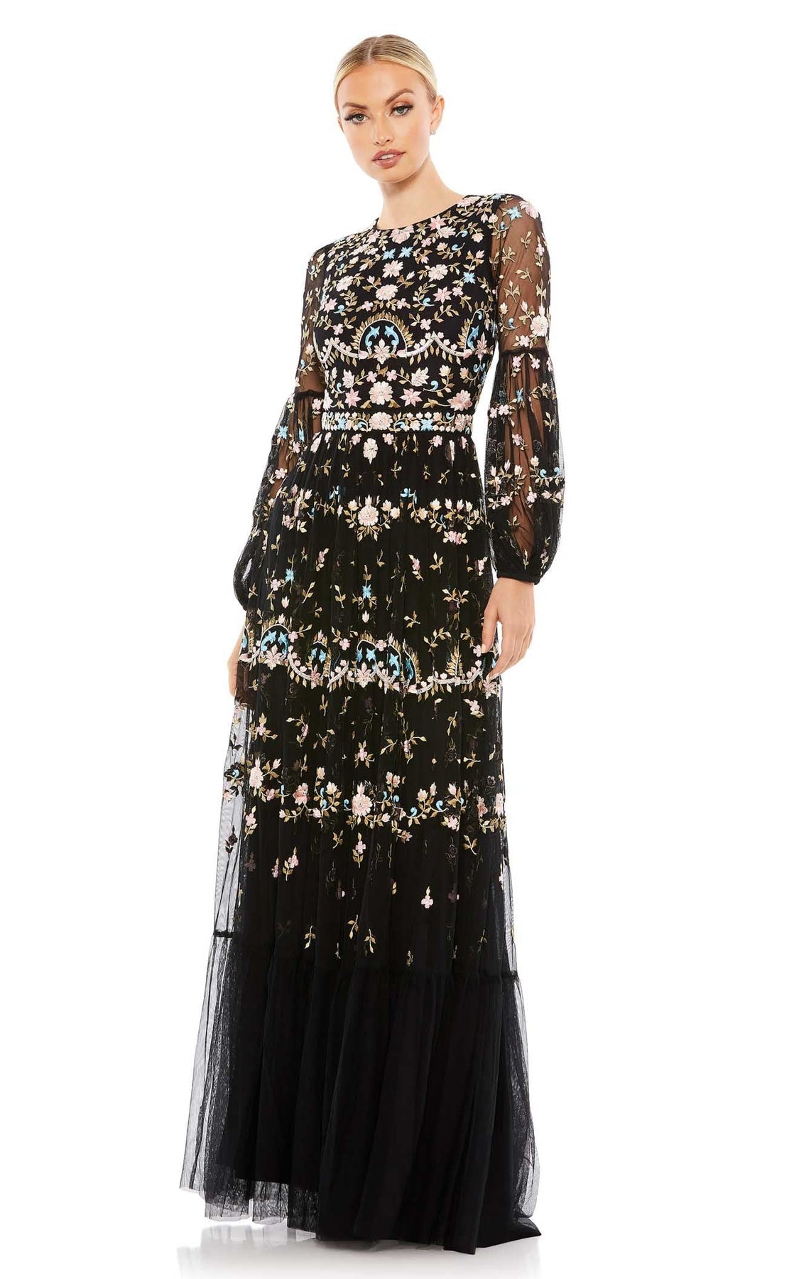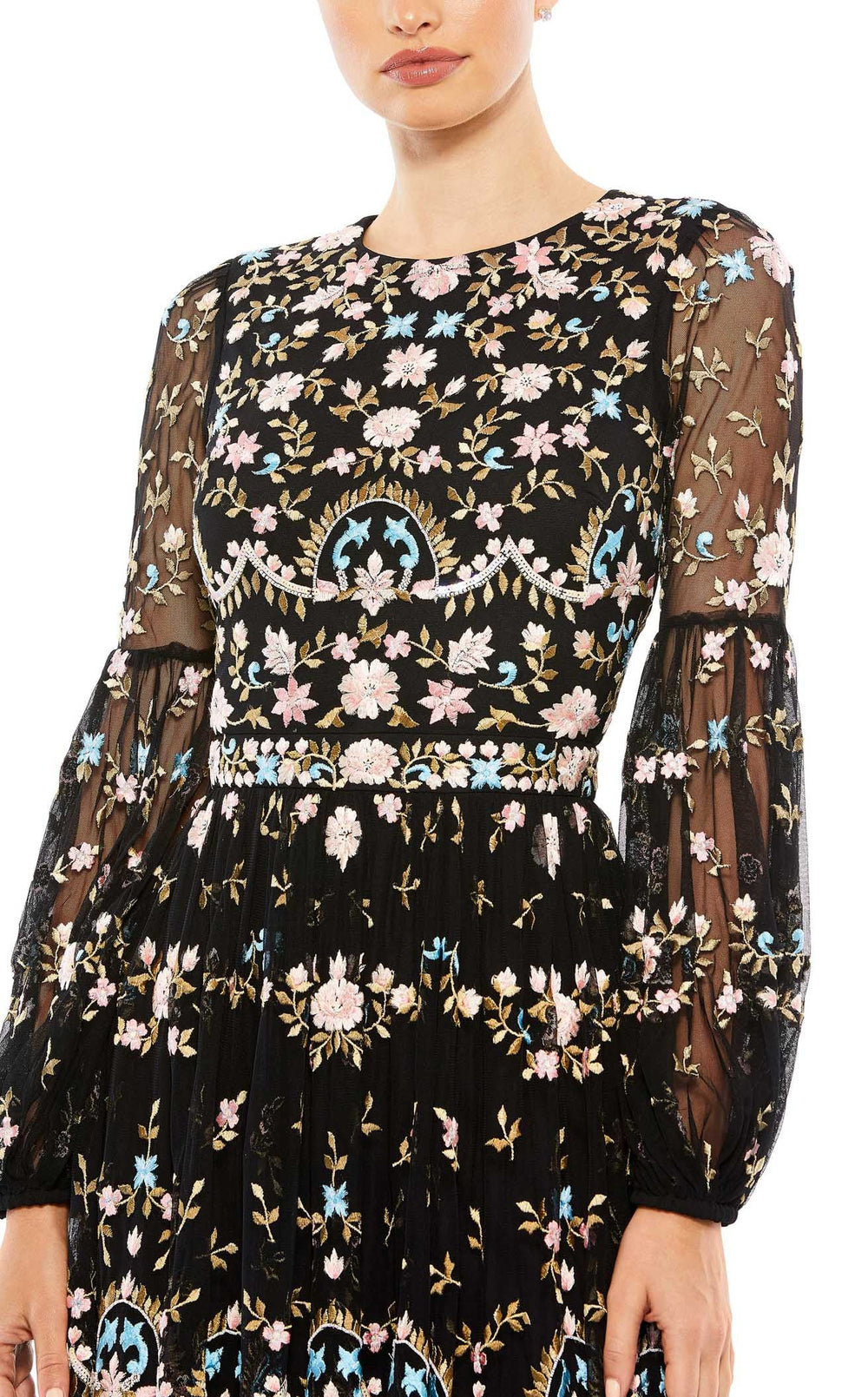 Embroidered High Neck Illusion Sleeve Tiered Gown By Mac Duggal
