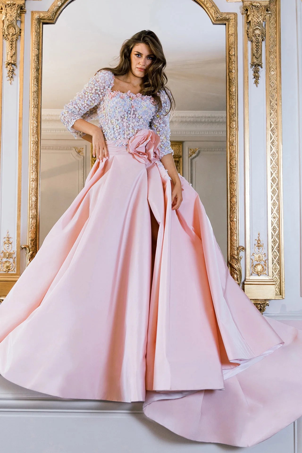 Multicolored tulle corset top fully embroidered with floral motifs, square neckline, three-quarter sleeves, taffeta princess-cut skirt, taffeta flower on side of waist, sweep train.Pink Color Size 42(10) Ready To Ship