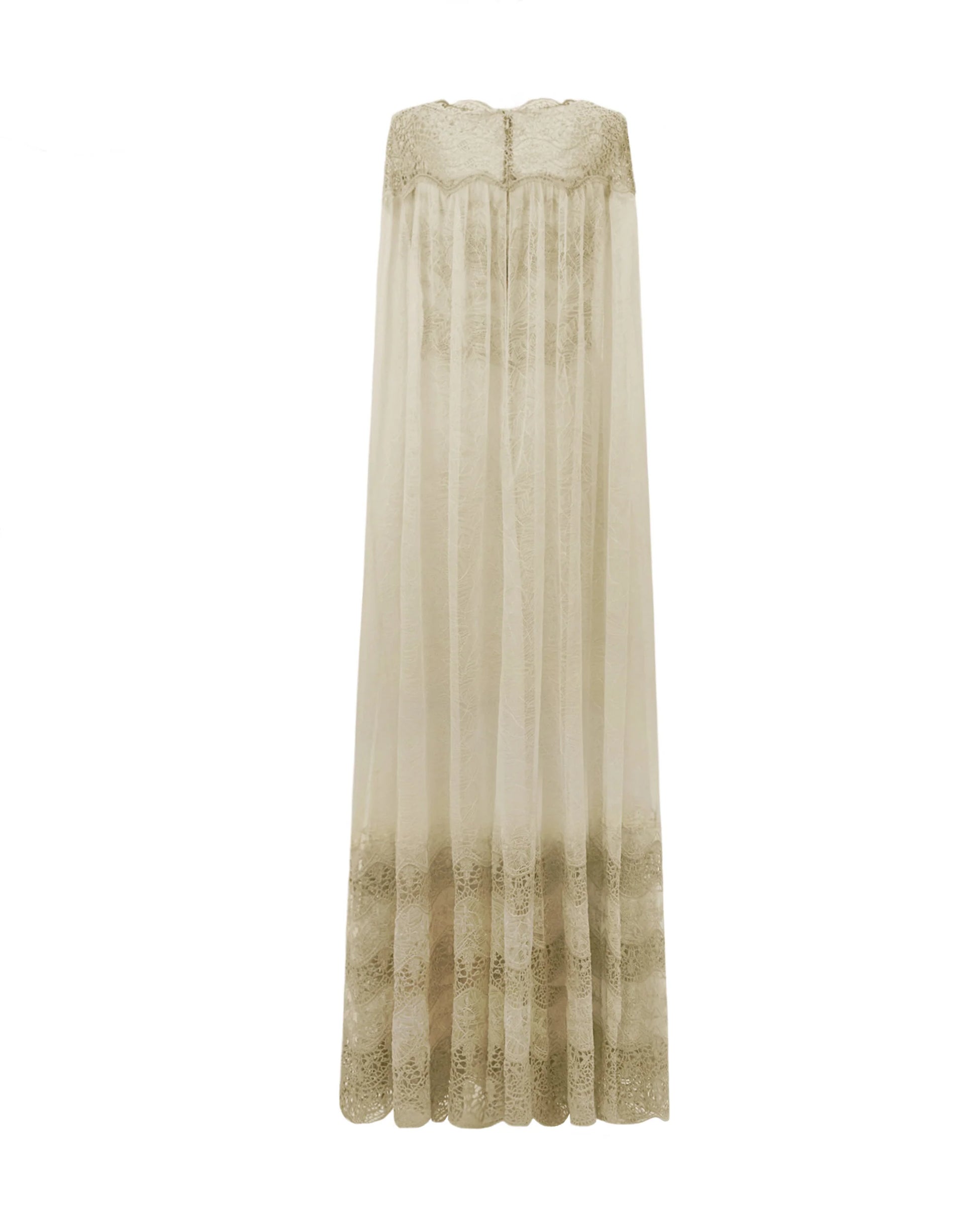 Long lace dress with cape-like floor-length sleeves.
