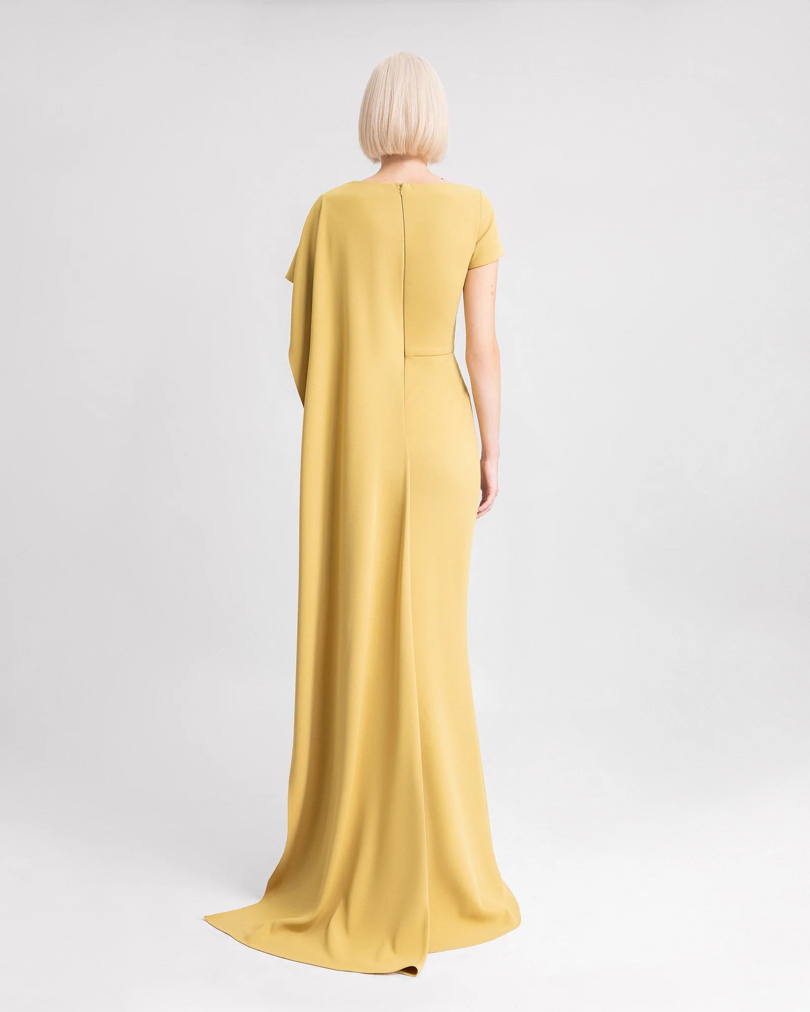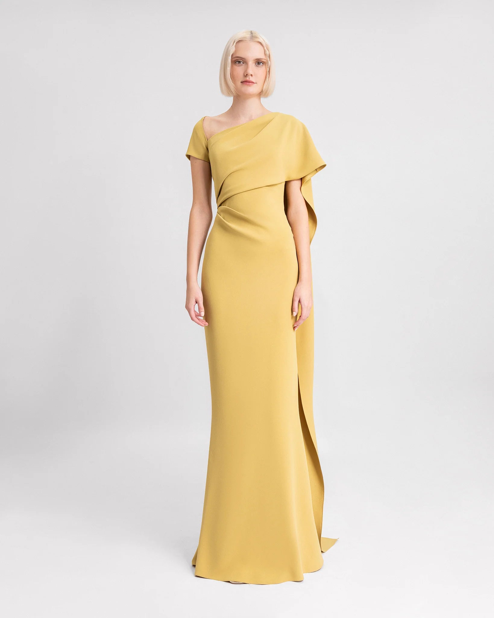Asymmetrical neckline dress featuring draping on the waistline and a long ruffled cape-like sleeve.