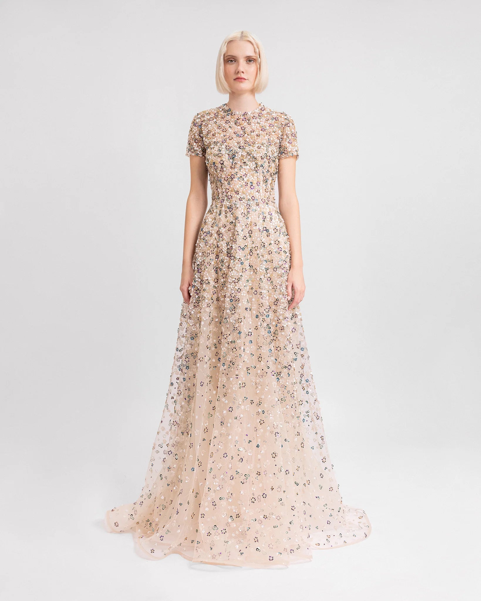 short sleeves, and a fitted bodice flowing into a full-length skirt.