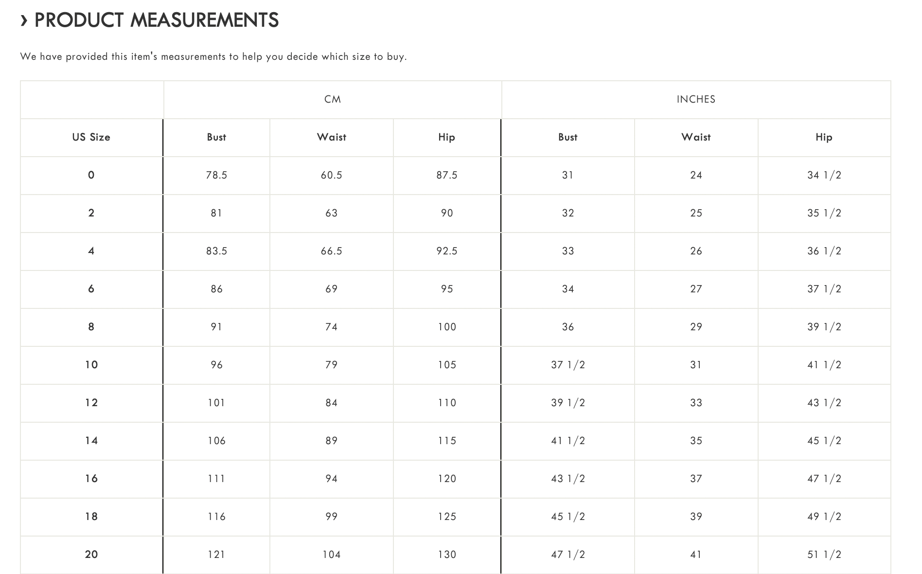 c. We strongly recommend that you check dress measurements before purchasing an item. Every product page includes a picture of the product accompanied by a size-chart that includes the measurements for the gown (measurements vary among designers so please pay attention to the measurement grid).