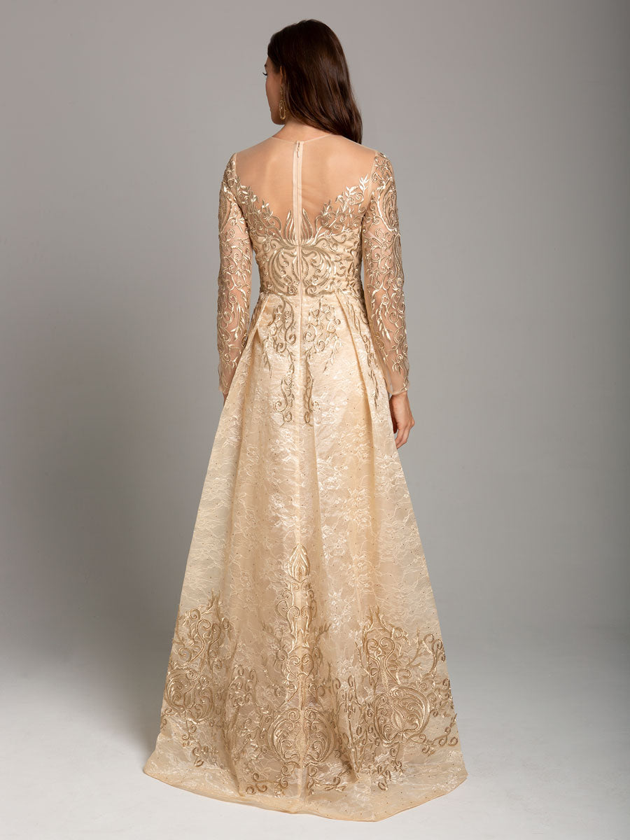 Long sleeve lace ball gown featuring rich lace appliques covered in rhinestones with a high neckline and small train.