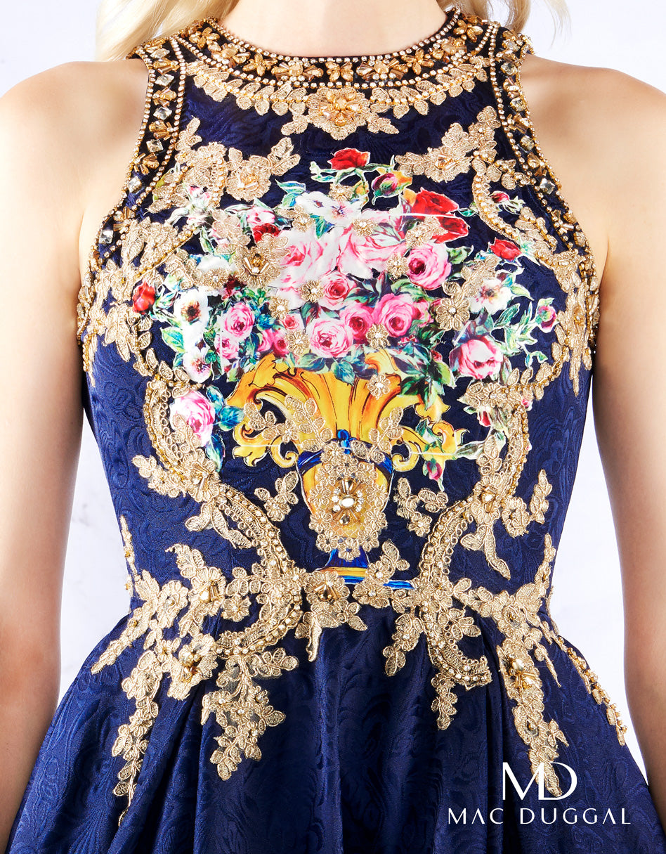 Boho – chic ballgown with heavily embroidered and beaded bodice. Large keyhole back.