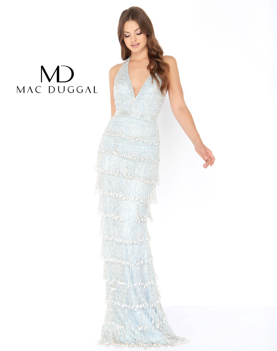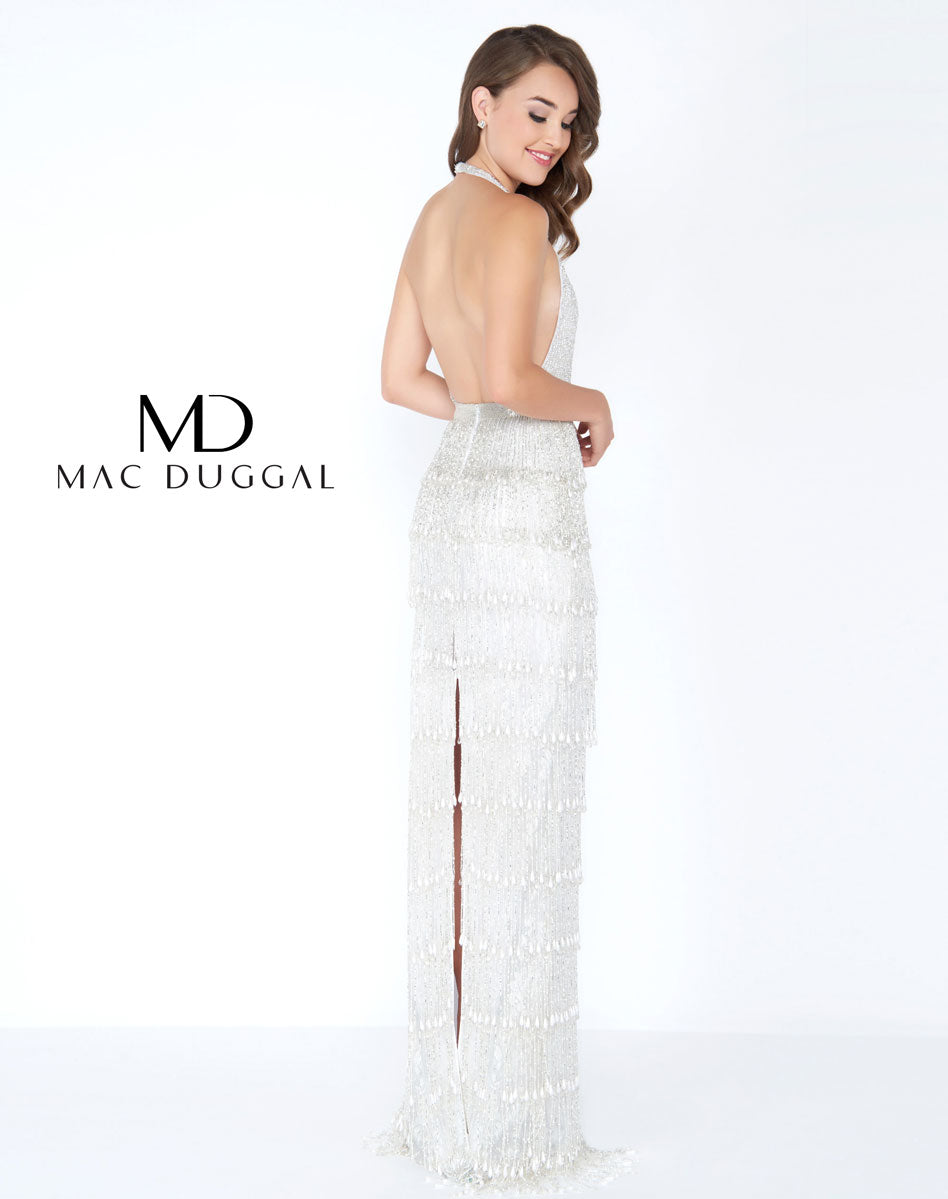Pearls & Beading! The perfect mixture of soft and elegant! Beader halter prom gown embellished with seed bead trimmed waist band, and full fringe skirt. The open back is accented with a high center back vent. (click on the video icon to watch the fringe shimmy and sway on the runway)