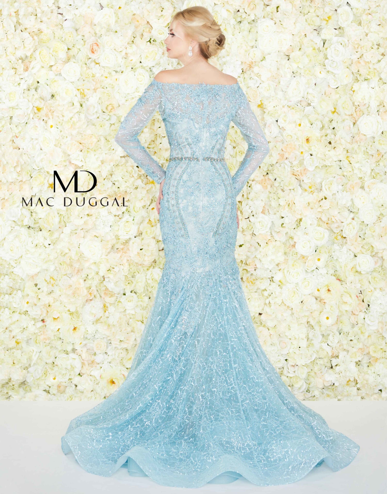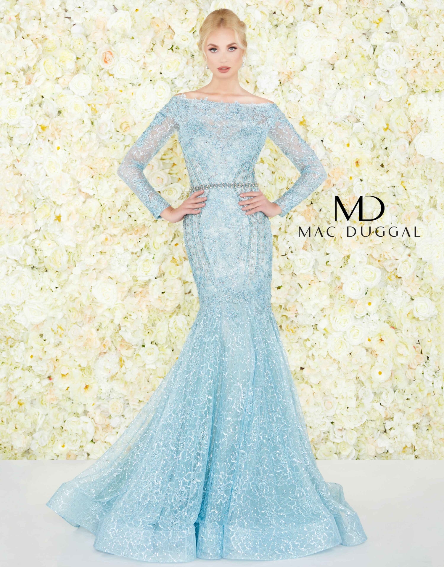 This French Blue gown is truly a vision of springtime glory and timeless elegance. Boat neck long sleeve mermaid gown enhanced with corded lace, sequin lace tail and beaded contour lines.