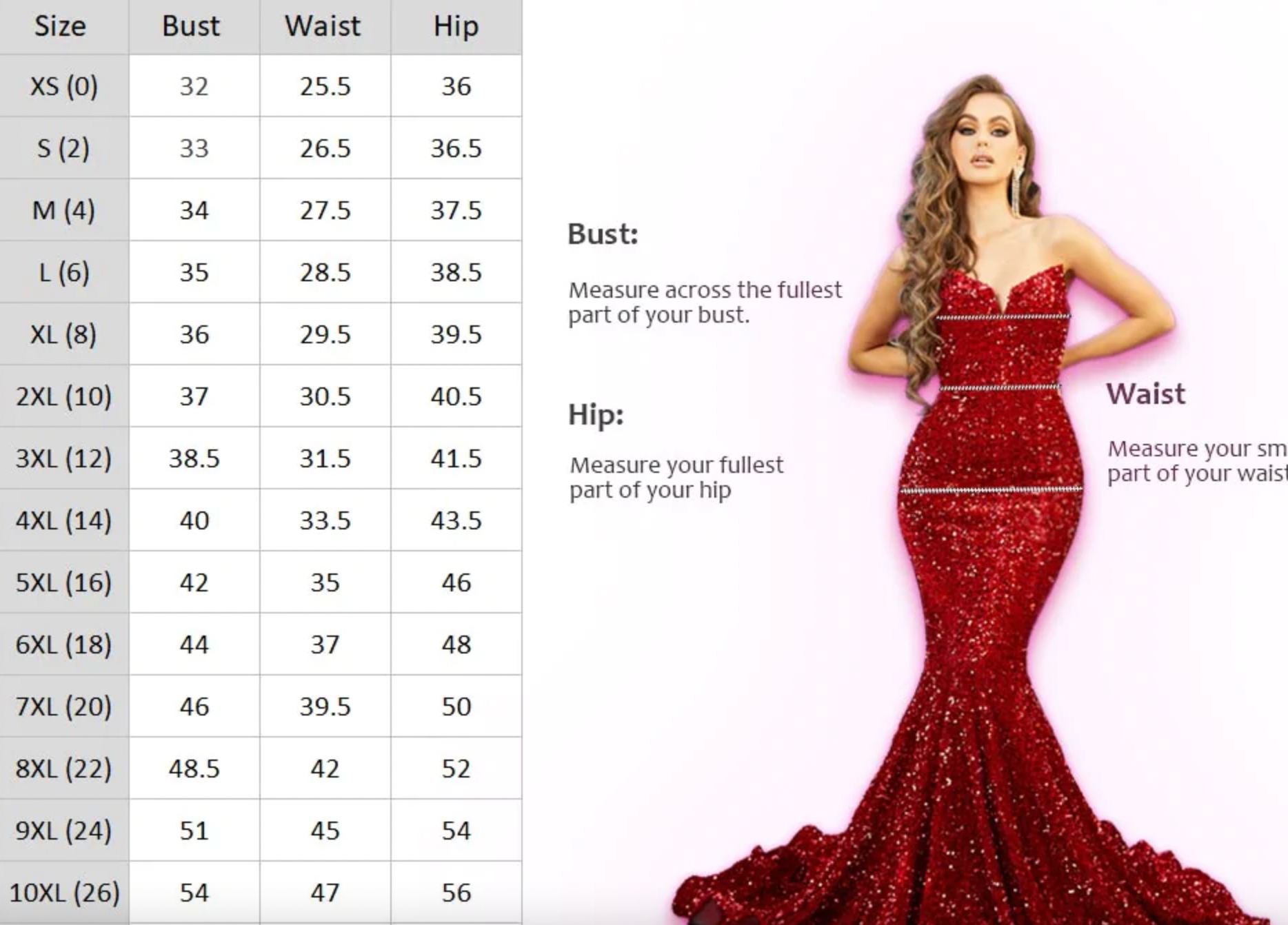 c. We strongly recommend that you check dress measurements before purchasing an item. Every product page includes a picture of the product accompanied by a size-chart that includes the measurements for the gown (measurements vary among designers so please pay attention to the measurement grid).