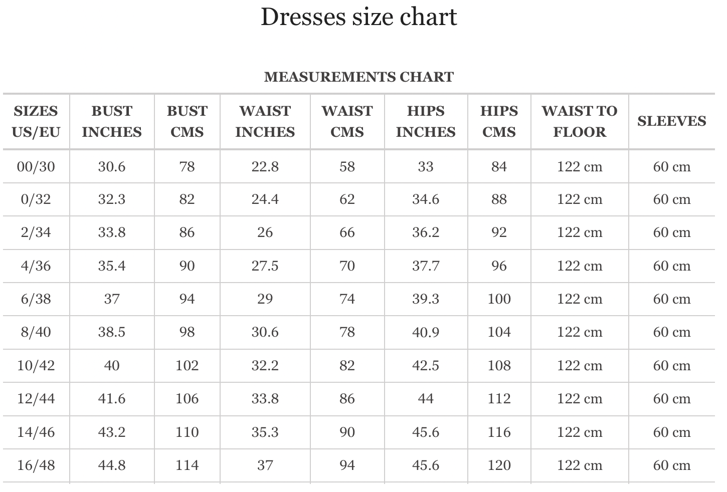 c. We strongly recommend that you check dress measurements before purchasing an item. Every product page includes a picture of the product accompanied by a size-chart that includes the measurements for the gown (measurements vary among designers so please pay attention to the measurement grid).