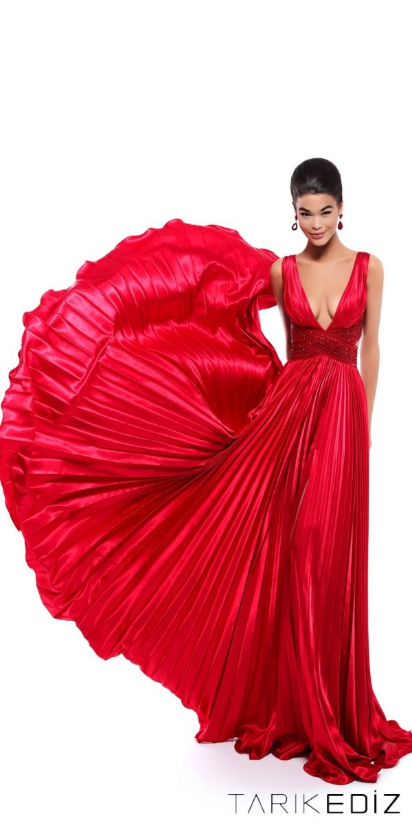 Beaded Criss Cross Back Fully Pleated Satin Gown by Tarik Ediz Prom Dresses