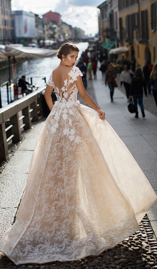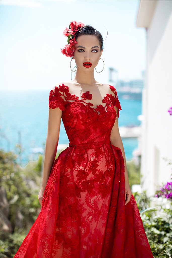 Get two dresses in one with this glamorous Tarik Ediz 93627 gown. Fashions an illusion bateau neckline with short sleeves. The dress is designed with short sleeves and a fitted bodice. Put on the detachable train to turn this elegant lacy dress into a show-stopping princess dress. Go for sparkly jewelry to complement the shiny embellishments all over the bodice.