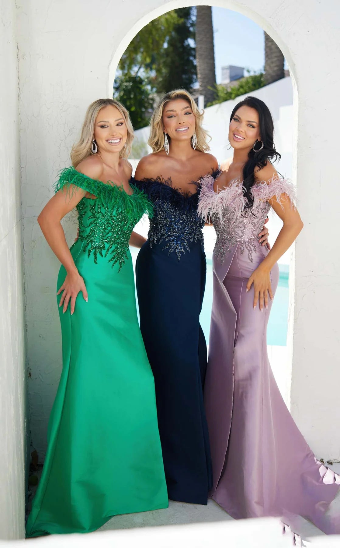 TERANI 241E2490 DRESS Sparkly Off-the-shoulder Dress with Feathers and Slit by Terani