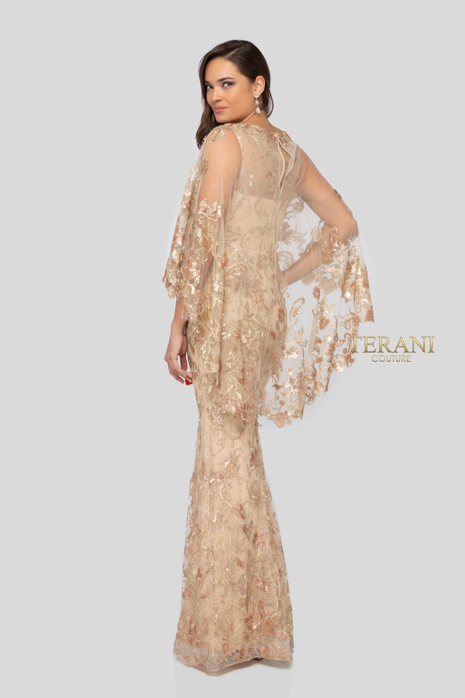 Rose Gold botanical sequins adorn this deep ‘V’ neckline floor length evening gown. An attached voluminous capelet adds to the breathtaking look.